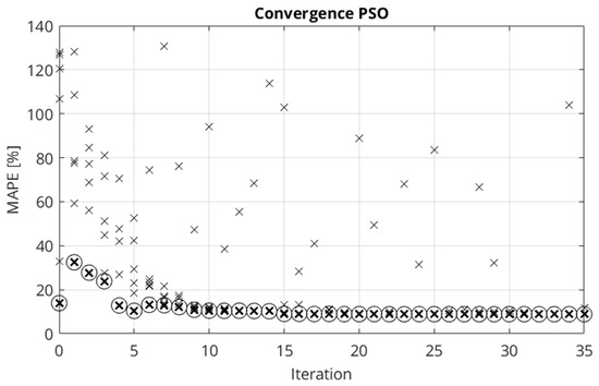 Convergence behavior of the PSO algorithm for material parameter identification. The crosses represent particles. The encircled crosses show the particle with the smallest mean absolute percentage error (MAPE) in each iteration.