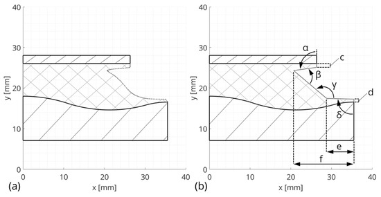 The spline of the elastomer contour resulting from the optical measurement (Figure 5a) is simplified with the help of four corner points and three connecting lines (Figure 5b). For the parameterization of the simplified elastomer contour, the two angles and , the two lengths and in the y-direction, and the two lengths and in the x-direction are introduced. The angles and result from their geometrical dependence on the implemented parameters. The parameters of the simplified elastomer contour are defined in a way such that the static transfer behavior of the reference bushing is nearly not influenced. These parameters are shown in Table 5.