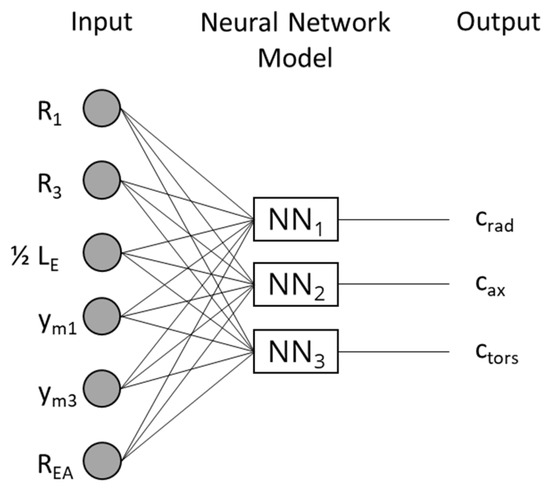 In the following step, the cleaned design parameter space formed the basis for the training of the ANNs. For the stiffness prediction in the radial, axial, and torsional load directions, one ANN was trained each. The network training was based on the Adam optimizer and 80% of the data was used for the training process. The remaining 20% of the data was used for the validation of the trained networks. To increase the prediction accuracy of the ANN, a hyper-parameter optimization based on Bayesian optimization was performed, resulting in three different ANN topologies.