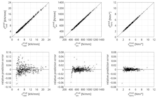 The ANN model of the radial stiffness has the highest total prediction error with . This is also shown in the level of the relative prediction errors in Figure 9, bottom left. In ranges of small stiffness values, the highest relative errors are present. The axial stiffness has smaller relative prediction errors (see Figure 9, bottom middle) and a smaller total prediction error with . The total prediction error of the ANN model for torsional stiffness is the smallest over the entire test dataset, with , and the ANN model has the smallest relative prediction errors (see Figure 9, bottom right). Table 10 shows the accuracies of the ANN models.