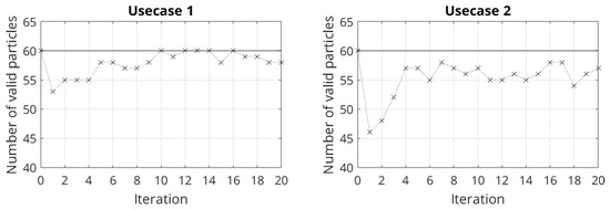 To evaluate the performance of the rating term (see Equation (31)), the number of valid particles in all iterations is considered in Figure 10.