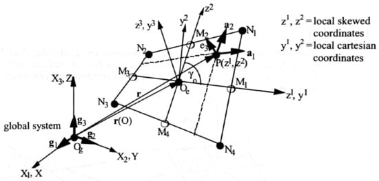 The total tire–road finite element (FE) model in this research consists of 8940 elements and 9617 nodes. All the rubber-like structural components in the tire were meshed using 3D elements including 3240 solid elements (H). The reinforcement cords and rebar layers were modeled using 1D elements including beam elements (BM), 2D elements including thin shell elements (S), and membrane elements (MB). As shown in Figure 1, MB in PAM-SCL is modeled as a two-dimensional element embedded in the three-dimensional space like a 3D solid element (which are tread top and tread base compound and cap ply in this research). They are defined to be formed in a wrapped mid-surface and isoparametric continua [24]. For this purpose, 120 BM were selected to simulate the embedded bead wires in the tire rim area. To model the steel belts, cap plies, and carcass cords, the 3780 S and 1800 MB were chosen.