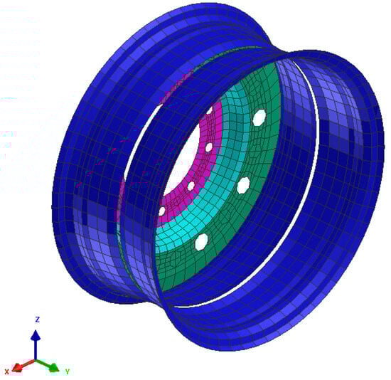To perform rim mounting, a rigid wheel is selected as shown in Figure 3. To assemble a tire on the wheel, aluminum alloy was assigned to the wheel and the wheel was defined as a rigid body to reduce the complexity of the simulation. This assumption was considered acceptable as the relative stiffness and mass distribution characteristics of the rim in comparison to other layers of the tire are much higher. In addition, in most on-road applications and especially passenger vehicles, the rim is rigid and does not deflect.