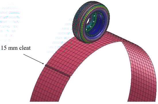 To determine the first and second mode of vibration for the tire, a drum-cleat test is performed according to the drum-cleat test standards [32,33], with the outside diameter of the drum being 2.5 m and with a 15 mm radius cleat. The tire has free rolling in the circumferential direction of the drum, with a constant rolling speed of 10 km/h, and a vertical load is applied in the tire center. During the drum-cleat test, the tire is rolled over an obstacle to excite the tire structure while it is loaded, and its center is fixed in the Z direction as shown in Figure 7. Finally, several tests were performed to investigate the effect of tire inflation pressure and tire vertical load on the drum-cleat test outputs. The results and post-processing are discussed in the results and discussion section.