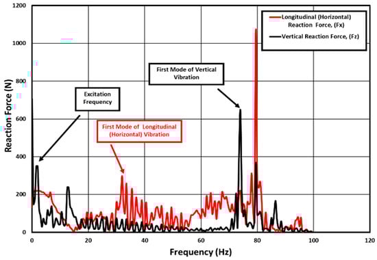 In this research, the input of the FFT is defined as tire section forces including longitudinal force and tire vertical forces in the time domain from the drum-cleat test. The first vertical mode of vibration is from the section vertical force . The first vertical mode of vibration is approximately equal to the second longitudinal (horizontal) mode of vibration. In addition, the raw data of the tire’s vertical reaction force and longitudinal (horizontal) reaction force from two sensors located in the tire center in the drum-cleat test were extracted. Additionally, the tire longitudinal reaction force and tire vertical reaction force are converted to the frequency domain.