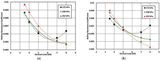 Figure 9a illustrates the effect of the vertical load and inflation pressure on the rolling resistance coefficient for a tire running at 10 km/h longitudinal speed. In general, as the vertical load increases, the rolling resistance coefficient decreases for all inflation pressures. For instance, the rolling resistance coefficient decreases by 27% when the load increases from 3.5 kN to 5 kN at a nominal inflation pressure of 228 kPa. At a low inflation pressure, the effect of the vertical load on the tire’s rolling resistance is non-linear at higher vertical loads, this could be attributed to the non-linearity in the contact area between the tire and the road. It should be noted that the rolling resistance force increases as the vertical load increases; however, the rolling resistance coefficient decreases with the increase of vertical load as noticed in the literature [35]. In general, the increased rate of the vertical load is higher than that of the rolling resistance force on a hard surface, causing a reduction of the ratio of the rolling resistance force to the vertical load (known as the rolling resistance coefficient). This phenomenon is also noticed and validated in the literature [36,37,38,39].