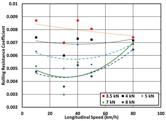 Effect of longitudinal speed on the tire’s rolling resistance coefficient at different vertical loads and a nominal inflation pressure of 228 kPa.