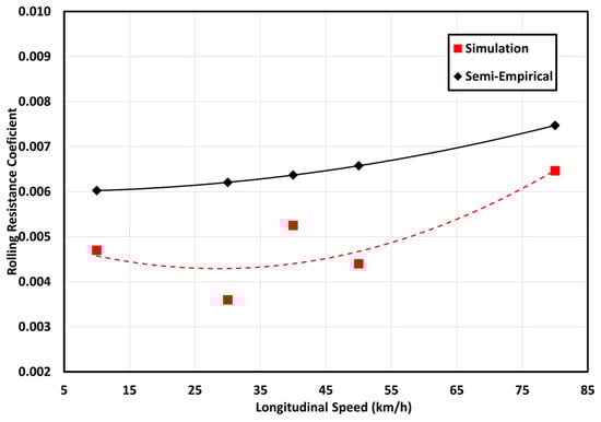 where V is the longitudinal (linear) speed of the tire in km/h. As shown in Figure 11, the results show a similar trend between the simulation results and the semi-empirical relationship. For instance, the simulation shows a 23% increase in RRC between 40 and 80 km/h, while the semi-empirical relationship shows a 17% increase in RRC. Since the semi-empirical relationship does not include the effect of load or inflation pressure, the simulations were selected at nominal conditions.