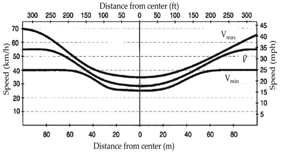Transforming intersections into roundabouts has shown that a sufficient degree of road safety and traffic capacity can be achieved without the need for traffic signals that induce traffic delays [4]. During the approach of a roundabout, drivers must reduce their speed, something that helps them move smoothly into, around, and out of a roundabout. Typical maximum, minimum, and mean speed profiles are shown in Figure 1. Lower speeds allow drivers to become adaptive to any kind of conflict with surrounding vehicles already in the circular pathway, such as pedestrians and bicyclists. Thus, converting junctions to roundabouts appears to be a commonly applied road safety measure in many countries [2,5,6,7].