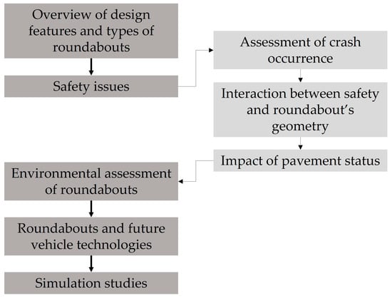 Building upon these preliminary remarks, the aim of the present paper is to briefly overview the main design features of roundabouts, the contribution of roundabouts to road safety, and provide a collection of discussion points and thoughts on current challenges and future perspectives for that type of road element. First, the terminology related to roundabouts is recalled together with the types of roundabouts, their advantages, and disadvantages. Thereafter, aspects about the contribution of roundabouts to road safety and the interaction with the design elements are discussed, followed by current research findings on the use of roundabouts by autonomous vehicles (AVs) and challenges related to simulation analyses. Finally, the concluding remarks of this review are summarized. As such, the main contribution of this paper lies upon revealing that roundabouts are major contributors to a safer vehicle movement, provided that the importance of geometric design elements is well-understood for both the era of the current vehicle fleet, as well as for more modern vehicle technologies. The research’s flowchart is given in Figure 2.