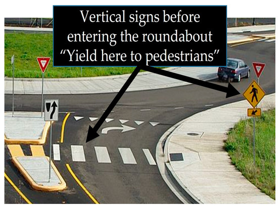With regards to pedestrians, a random crossing at the roundabout definitively limits its capability in terms of both vehicle capacity management as well as pedestrian safety [42]. Vignali et al. [43] recognized that research about roundabout safety usually focuses on drivers and vehicle movement and, unfortunately, overlooks the importance of safety for the vulnerable users including pedestrians and bicyclists. A solution to this issue could be the improvement of infrastructure conditions, like proper pavement marking (Figure 6). Indeed, in a recent study, the potential of moving the pedestrian crossings before the entrance to the roundabout has been commented as a contributor to road safety in the case of urban roundabouts [43].