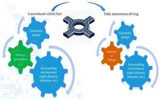 Investigating the role of AVs on the status of current road infrastructure provides a unique opportunity for the transportation engineering community. Among others, the contribution of AVs on the roundabout capacity and safety have attracted a lot of research interests [11]. Autonomous driving in roundabouts requires the understanding of complex relationships between road design features, traffic rules, and the performed maneuvers of various road users [70]. According to Figure 8, in a fully autonomous vehicle driving environment, the Internet of Things will be responsible for any kind of decision maneuvers, where the driving behavior and drivers’ perception will have no impact.