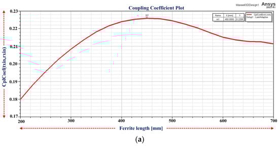 Figure 15 describes the design parameters of Tx and Rx to obtain optimality. It depicts about three cases, which correspond to the ferrite length, ferrite width, and coupling coefficient. From this figure, it is evident that the optimal k of 0.2451 is achieved while changing the length and width of ferrite on Tx and Rx. For this k value, the optimized length of each ferrite bar is 400 mm and its width is 57.5 mm. Further, the exact coupling coefficient is achievable with ferrite bars, and it depends on various factors including the specific design of the WCS, the quality of the ferrite material, and the distance between the coils. Moreover, it is important to note that a coupling coefficient above 0.2 is easily achievable, especially in the case of ferrite bars and, in some cases, substantially higher.