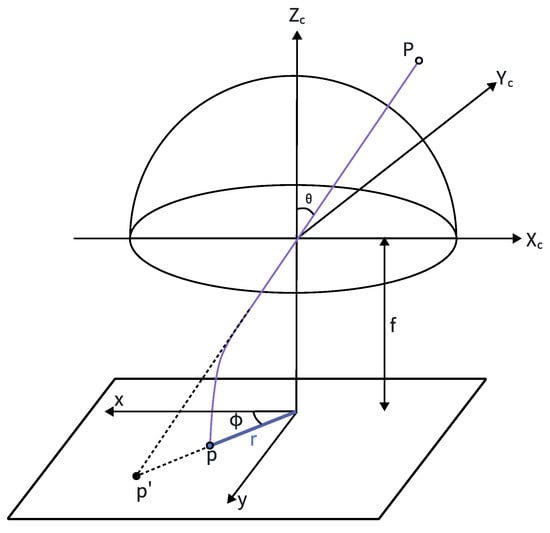 To obtain a universal expression, in the research by Kannala and Brandt [], a general radially symmetric model (Equation (4)) is used to represent the perspective projection model of traditional, wide-angle, and fisheye lens cameras, and a corresponding calibration method is provided.
