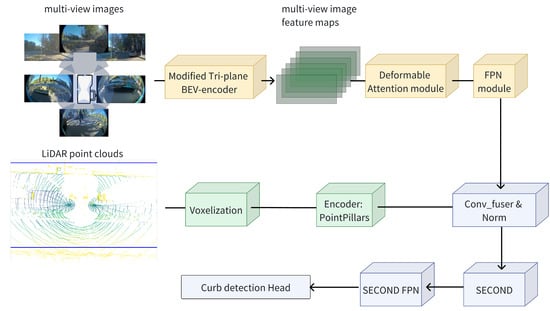 To fuse multi-modal sensor data (to fuse multi-modal sensor data from a setup comprising five LiDAR and six cameras, including both pinhole and fisheye types), this paper designs a curb detection network structure as shown in Figure 3 and implements it using the MMDetection [] framework.