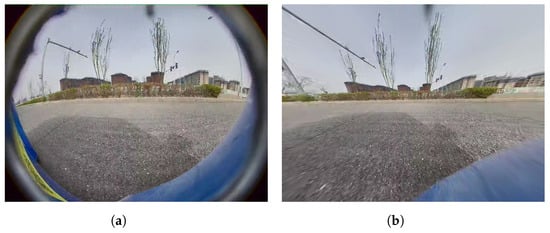 To test whether correcting the distortion of fisheye cameras affects feature extraction, this paper employs the Kannala–Brandt model [] to correct the original images from fisheye cameras before using them as the initial input for network training, as is shown in Figure 4. It also compares the impact on detection performance with and without the fisheye camera distortion correction step.