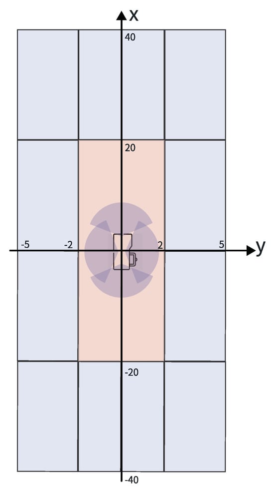 In the coordinate system of the ego vehicle, the direction of the road edge is generally considered the boundary of the vehicle’s lateral (y-axis) movement range. From the perspective of motion control, lateral constraints on the movement planning of autonomous logistic vehicles are primarily imposed, encompassing aspects such as lane selection and the obstacle avoidance strategy choices of the autonomous delivery vehicle. On the other hand, given the current situation in which autonomous logistic vehicles predominantly operate in urban-area bicycle lanes and exhibit a lower average traveling speed compared to passenger cars, the precision of predictions in the y-direction is relatively more critical than in the x-direction. Therefore, this study defines the area of interest for evaluating the proposed perception algorithms as the range shown in Figure 5. A resolution of 2 m in the near field and 3 m in the further field on the lateral side (y-direction) is utilized to ensure that the evaluation area sufficiently covers lane planning and prevents collisions with road edges. A resolution of 20 m in the longitudinal direction (x-axis) is adopted in order to meet the requirements for maintaining a safe following distance. Additionally, the evaluation metrics introduced in Section 4.4 are employed to calculate the quantified average perception performance within each segmented area.