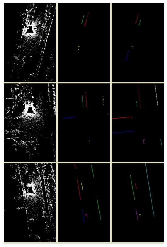 Schematic illustration of curb detection results. From right to left, the first to third columns represent the LiDAR points BEV diagram, ground truth annotations of curb instances on the BEV plane, and visualization of the network’s detection results, respectively. (Different colors represent different curb instances).