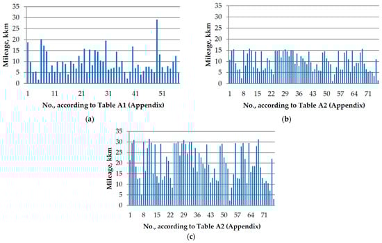 Figure 1a,c show each car’s mileage at the time of the first inspection in its respective country (according to Table A1 and Table A2 in Appendix A). To make the data easier to interpret, the data for cars from Poland are presented in a format measuring half the time between inspections, i.e., one year. The average mileage until the first inspection for cars in Kazakhstan was 9526 km, while the average annual mileage for Polish cars (concerning the half-cycle between inspections) was 10,029 km. This is interesting, as in Kazakhstan, the distances between cities are much greater than in Poland. However, this can be explained by the condition of the road surfaces. According to the data by Shakhmov and Hafiz (2021) [] in Kazakhstan, the road quality is at times worse than in Poland. Additionally, European transportation infrastructure is sufficiently developed, as evidenced by Hussain et al. (2020) [], which may favor longer car journeys. Figure 2 shows the distribution of car mileage in intervals of 5000 km.