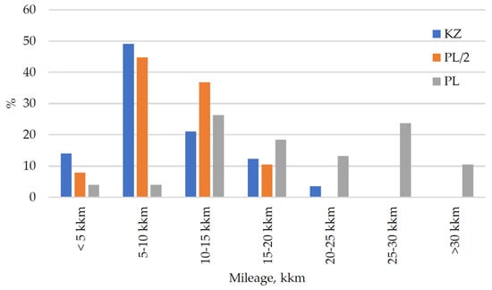 Mileage percentage intervals of 5000 km: KZ—Kazakhstan; PL/2—Poland considering the half-cycle between inspections; PL—Poland.