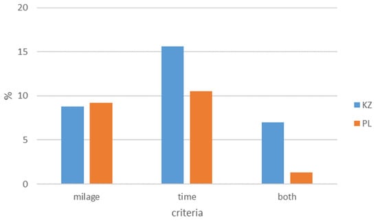 Figure 3 shows the percentage of cars that exceeded the criteria for the first inspection recommended by the manufacturer. In Kazakhstan, 31.4% of cars did not meet the warranty conditions, while in Poland it was 21.0%. The dominant criterion that was not met was the time criterion, amounting to between 10.5% and 15.6% of the total number of cars at the time of the first technical inspection.