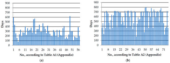 The bar chart of the days between the purchase date and the SI-1 (according to Table A1 and Table A2 in Appendix A): (a) Kazakhstan; (b) Poland.
