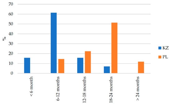 The histogram in Figure 5 clearly illustrates the difference in the timing of the first SI for cars from Kazakhstan and Poland. In numerical terms, within the period of up to 6 months, there are nine vehicles, from 6 to 12 months there are thirty-five cars, from 12 to 18 months there are nine cars, and from 18 to 24 months there are four cars from Kazakhstan. In contrast, for cars from Poland, there are eleven vehicles from 6 to 12 months, seventeen vehicles from 12 to 18 months, thirty-nine vehicles from 18 to 24 months, and nine vehicles that have undergone the first maintenance after more than 24 months.