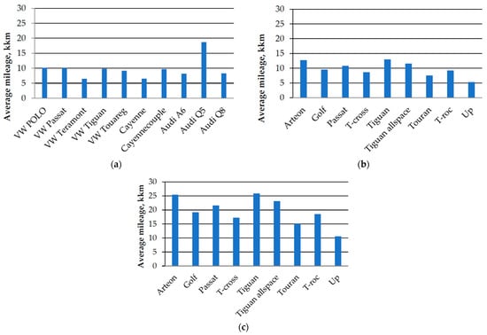 The average mileage for the first technical service (Figure 6a) falls within the range of 6462 to 18,738 km depending on the car type from Kazakhstan. The minimum mileage is observed in Volkswagen Teramont, at 57% lower than the value of 15,000 km. Polo and Tiguan have lower mileage by 32–34%, Passat by 25%, Touareg by 39%, and Audi A6 and Q8 by 45%. Only Audi Q5 shows an increase of 25% in mileage. In Poland, the average mileage on the first technical service (Figure 6c) ranges from 10,616 to 25,926 km, depending on the car model. The lowest mileage is observed for the Volkswagen Up, at 29% lower than the value of 15,000 km. The highest mileage is recorded for the Tiguan at 25,926 km and the Arteon at 25,464 km.