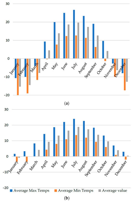 The climate in a particular region plays a significant role in the wear and tear experienced by vehicles []. Extreme temperatures, whether hot or cold, can affect the performance and longevity of various vehicle components. The climate in Astana, Kazakhstan exhibits a significant temperature range in Figure 7. When comparing the climate conditions in Astana and Poznań, noticeable differences become apparent. In January, the average maximum temperature over three years in Astana is −10.7 °C, with a minimum of −20 °C, while Poznań experiences an average maximum temperature of 1.7 °C and a minimum of −3.3 °C. Moving to February, Astana records an average maximum temperature of −10 °C and a minimum of −19 °C, while Poznań sees an average maximum temperature of 3.3 °C and a minimum of −3.3 °C.