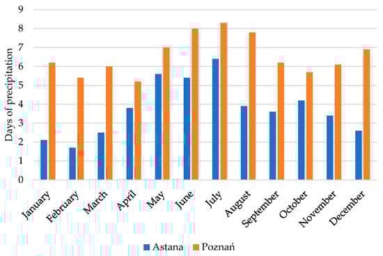 Humidity levels in each area can have a notable impact on vehicle maintenance as well. Higher humidity levels can contribute to increased corrosion of metal components, degradation of electrical connections, and potential damage to the vehicle’s exterior and interior surfaces. Humidity likewise impacts the stability of electric sensors, as with the increase in ambient humidity, the response of the sensor attenuates rapidly and the phase shift increases rapidly []. In regions with elevated humidity, greater attention to rust prevention, interior conditioning, and electrical system maintenance may be necessary to ensure the long-term health of the vehicle. Furthermore, the humidity, as indicated by the number of days with precipitation, is higher in Poznań than in Astana in Figure 8. For instance, in July, days of precipitation were measured at 8.3 in Poznań and 6.4 in Astana. The higher frequency of rainy days in Poznań indicates a more humid climate throughout the year. This suggests a greater need in Poznań for specialized maintenance practices to mitigate the effects of moisture on vehicle components. This is because greater attention to rust prevention and electrical system maintenance may be necessary to protect the vehicle from the negative effects of humidity. When comparing the results with those in [], it is evident that they are similar to the findings in the study that humidity is an important factor influencing the stability of the electronic system. The study in [] found that as air humidity goes up from 0% to 60%, the critical electrical field where breakdown occurs increases by 1.22 kV/cm.
