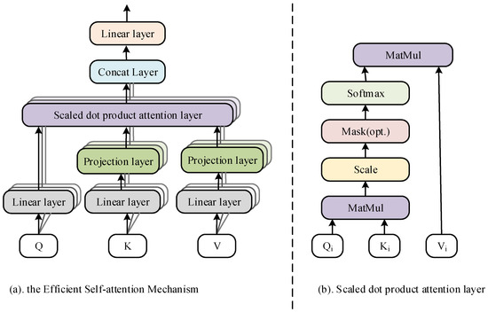 To address this problem, this paper proposes an Efficient Self-Attention mechanism, which reduces the dimensions of K and V by incorporating a linear projection matrix with learnable parameters in the process of calculating the Self-Attention, and thus realizes the purpose of reducing the computation of the model. Equation (6) shows the specific calculation method: