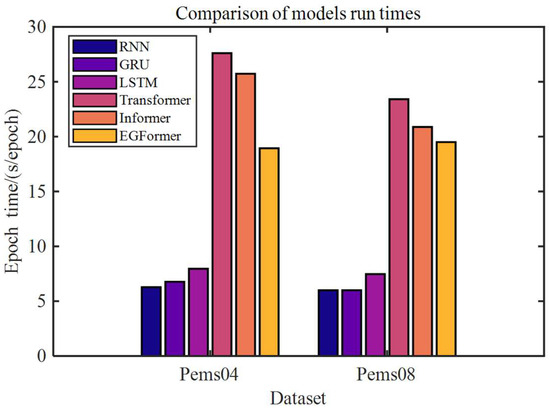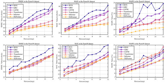 • This paper establishes the EGFormer based on the encoder–decoder structure and implements traffic flow forecasting tasks on this basis. The authors conducted extensive experiments using the public traffic flow datasets Pems04 and Pems08 to verify the performance of the model. The experimental results demonstrate the superiority of the model.