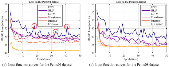The experimental datasets used in this paper are derived from the public highway datasets Pems04 and Pems08, collected by the California Department of Transportation’s Performance Measurement System. The time interval for these two datasets is 5 min, meaning each sensor collects 288 data points per day. The Pems04 dataset includes data from 307 nodes in the San Francisco Bay Area network, collected from 1 January to 28 February 2018. The Pems08 dataset contains traffic data from 170 sensors in Los Angeles County, collected from 1 June to 31 July 2016. As this paper mainly focuses on the problem of single-node traffic flow forecasting, only the data from node 0 of each dataset were used in the experiments.