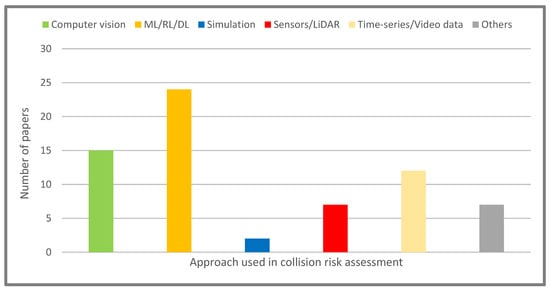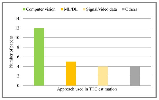 In Figure 4, we have summarized the number of papers investigated in each approach used in TTC. As can be verified, most research work is oriented to computer vision-based approaches in TTC estimation.
