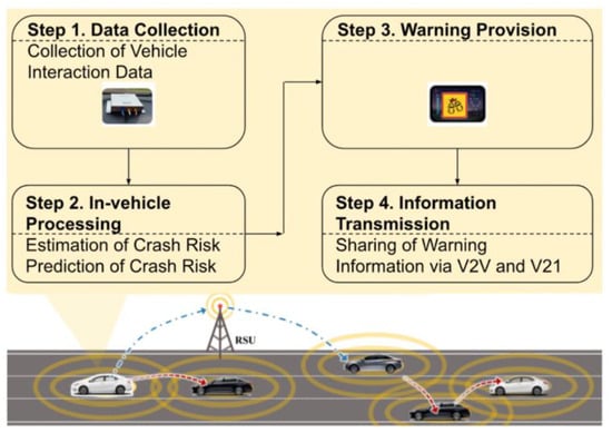 A sample vehicle-to-vehicle (V2V)-based proactive traffic safety control system is shown in Figure 5 (see [29]).
