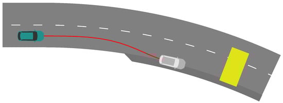 Exemplary scenario that may require a stopping maneuver. The yellow obstacle obstructs the street. The turquoise car depicts the initial position; the gray car depicts the final position. The computed safe stop trajectory is displayed in red.