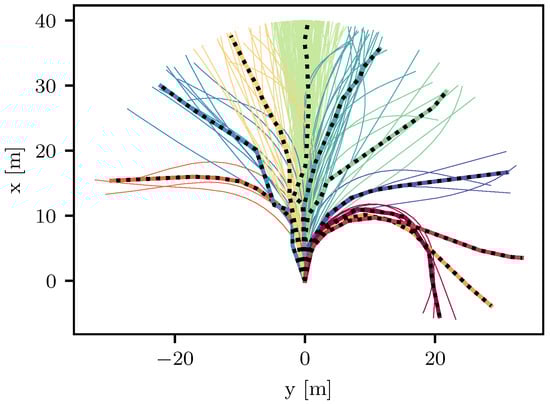 For our numerical experiments, we employed a training and evaluation data set. To obtain them, we documented the trajectory of a research vehicle navigating in manual mode within a suburban environment. The vehicle was outfitted with an advanced localization framework, as detailed in [31], ensuring an accurate position estimation. Subsequently, the acquired data were organized into two distinct sets of lane centers. The training data set encompasses 239 curves, while the evaluation data set comprises 105 curves. Both can be found in [32]. The algorithm presented in this paper is configured to aim for good performance with respect to the training data set. Eventually, the evaluation data set was used to assess the performance of the final algorithm. As an estimate for all possible lane centers, we used a training data set of lane centers. Figure 2 shows the results of the clustering on our training data set, where the number of clusters was set to ten.