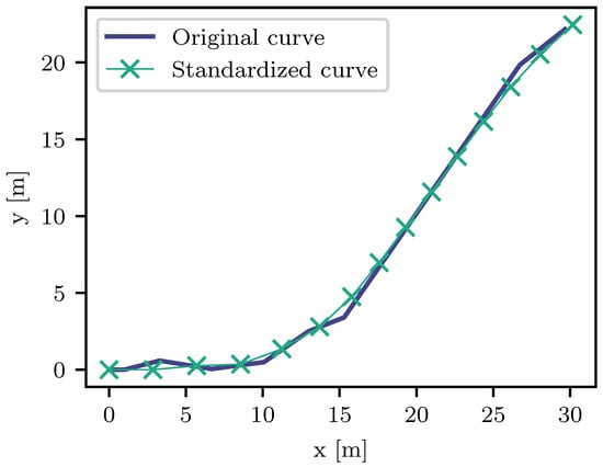 We chose as the fixed number of vertices and as the total length of a lane center, leading to a distance of between two adjacent vertices. It was assumed that the controlled vehicle was initially at the origin of the coordinate system, and its orientation was aligned with the x-axis. Additionally, we assumed that the vehicle’s position corresponded to the start of the lane center, with the same orientation as the first lane center segment. These assumptions decreased the number of cases which had to be considered during trajectory computation. Hence, we required each standardized lane center to meet these requirements. The cluster centers resulting from the above-described clustering algorithm may have kinks, which can cause issues in the trajectory computation algorithm. Thus, in a process of standardization, we performed smoothing by fitting a B-spline curve to the cluster center using the B-Spline calculation method from [33]. Since the first two vertices of the standardized lane center are fixed, the start point of the B-Spline is the second fixed vertex. The B-Spline is then determined to fit the subsequent vertices of the curve that shall be standardized. Beginning with the start point of the B-Spline, the next vertex of the standardized lane center is the point on the B-Spline with the fixed distance to the current one. Figure 3 depicts an example of the standardization process.