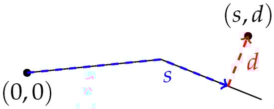 We introduce Frenet coordinates [34] to uniformly define the final positions of a car with regard to any lane center. By means of Frenet coordinates with respect to lane centers, we can specify the final positions uniformly and deduce the designated orientation of a car. A Frenet coordinate pair describes a Cartesian point with respect to a parametrized curve. Here, d quantifies the distance between and the curve, while s describes the length from the start to the point of the curve at the minimum distance, as in Figure 4. Note that d is a signed value depending on whether the given point is on the left (+) or right side (−) of the curve. The function maps Frenet coordinates regarding a curve to the corresponding Cartesian coordinates and the orientation of the curve segment closest to the point. It is defined by the result of Algorithm 1.