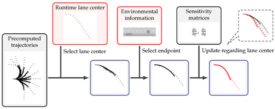 Process of the trajectory computation at runtime. Gray boxes indicate inputs from the precomputation phase; red boxes indicate inputs from sensor fusion.