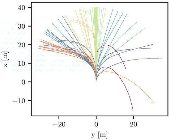 In this section, we aim to compute trajectories along the representative lane centers of all clusters found using the method described in Section 3. To obtain trajectories, we solve nonlinear program (26), which is a discretization of optimal control problem (21). In our experiments, we set the initial speed to and the final position in Frenet coordinates to and . We chose d to be negative since this corresponded to a stopping position at the edge of the road in right-hand traffic. Hence, for each representative lane center, nine trajectories belonging to different final positions were calculated. Problems belonging to the same lane center were solved consecutively, using the previous solution as an initial guess. If the lane center changed, the initial guess for the position and orientation followed a Dubins path. This path is the shortest curve between a given start and end, taking a minimum turning radius into account [38]. We relied on the implementation [39] to compute such curves and used as an approximation for the minimum turning radius [40]. Since the Dubins path only provides an estimate for the position and yaw, the other values had to be guessed differently. We used a simple guess as we set the velocity to linearly decaying and the other values to 0. To solve nonlinear programs, we used the solver Worhp [41] for this work. Finally, all trajectories and corresponding sensitivity matrices were stored for runtime use.