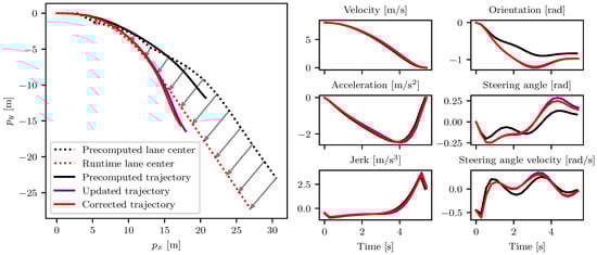 Figure 7 illustrates an example for the trajectory computation algorithm given a specific lane center in the evaluation data set. Here, the trajectory generated by applying the first-order Taylor approximation regarding the lane center (step 2 of Algorithm 2) is already close to being feasible and only shows small deviations from the trajectory obtained after applying further correction steps. Furthermore, it is noticeable that all states and controls are relatively smooth and jump-free. This is a valuable asset for a trajectory planner, as it simplifies the problem for the control module.