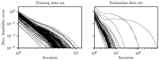 We required a maximum feasibility error of to denote a trajectory as feasible, which was also the requirement during precomputation. When implemented on a vehicle, this tolerance may be relaxed to speed up runtime calculations. Figure 8 displays the course of the maximum feasibility error over the number of iterations for each lane center from the training and evaluation data set. The algorithm exhibits favorable results on both data sets and terminates successfully in all cases. In the evaluation data set, two instances stand out due to their considerably higher convergence iterations compared to others. Specifically, these instances require 105 and 740 iterations to achieve convergence within the prescribed maximum feasibility error. The slower convergence can be attributed to the presence of a sharply curved section in the track recording underlying the evaluation data set. The initial velocity is set to 8, a speed that would be considered excessive for this particular curve in typical traffic conditions. Notably, such sharp curves are absent in the training data, posing a challenge for the algorithm in computing a feasible trajectory within the specified constraints on steering angle and steering angle velocity. At the beginning of the iteration process in the feasibility correction algorithm (Algorithm 2), these constraints are violated by the trajectories resulting from the sensitivity update in steps 2 and 6. The violation is subsequently corrected during projection steps 3 and 7, which introduces an error in the differential equation and counteracts the preceding sensitivity update step. Consequently, many iterations are required to achieve feasibility. Despite these challenges, the algorithm manages to find a feasible solution.