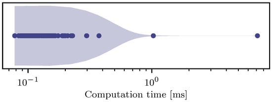 Computation times in milliseconds required at runtime to compute a trajectory for each lane center in the evaluation data set. The distribution as a violin plot and the individual samples are displayed.
