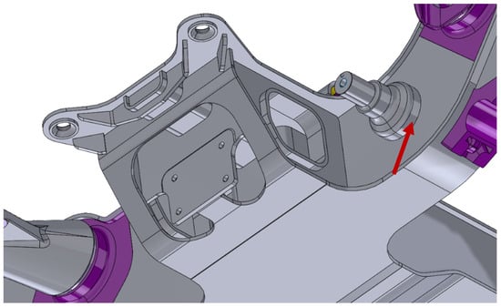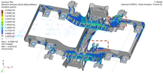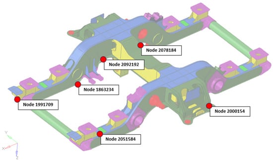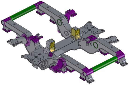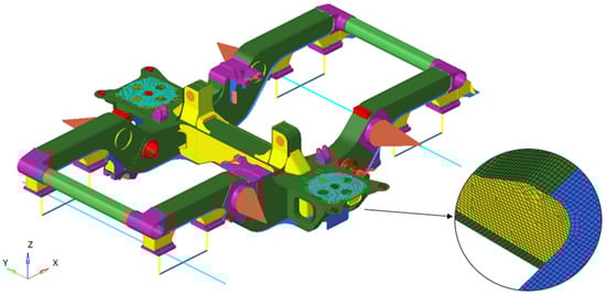 Figure 5 illustrates it and a meshing detail in the most critical area. The structure of the component, including the central crossbeam, the longitudinal beam, and the perimeter crossbeams, was modeled using a two-dimensional mesh consisting of SHELL elements of QUAD4 type, with an average size of 10 mm and a minimum size of 3 mm. The sensitivity analysis performed on the component grid allowed us to ensure the good quality of the mesh and reliable results, especially for stress evaluation. All the supports described in the previous section, on the other hand, were composed of a three-dimensional mesh of second-order TETRA elements (TETRA10 type), with the same dimensions as the two-dimensional elements. The choice of different types of elements depended on the characteristics of the components. The bogie frame featured thinner thicknesses well represented by the numerical formulation that describes the mechanical behavior of shell elements. On the other hand, the supports had three-dimensional development geometries that necessitated solid elements. These two types of mesh could not be connected directly, as the 2D mesh had elements of the first order. An effective solution was found to join to the main structure all the supports modeled with solid mesh: the use of a freeze/bonded contact. This type of contact configuration ensures the linearity of the model, and the complete redistribution of all the stresses acting (both forces and moments). In detail, it enforces zero relative motion on the contact interfaces, the gap between them remains fixed at the original value and the sliding distance is forced to be zero. In this way, the use of the FE model was improved, ensuring the accuracy of the results and simplicity of modeling. Another important advantage of this approach was to be able to separately modify both the supports of the various subsystems and the main frame, increasing the speed of potential changes and subsequent numerical tests. Loads were applied with different approaches, according to the application zone. In addition to classical forces and pressure, zero-dimensional RBE3 elements were also utilized. These elements prevented the addition of stiffness to the structure, effectively distributing the loads among the respective nodes. The primary suspension (yellow color), which acted as a suspensive stage between the wheelset and the bogie frame, was modeled using one-dimensional elements. The accurate representation of this system was of crucial importance as it was essential to faithfully replicate this specific connection point, avoiding the introduction of excessively stiff constraints that could generate extremely high stresses, which did not result in realistic outcomes. The modeling of the axle (light blue color) and the pin seat was accomplished using one-dimensional beam elements with congruent sections. The conical rubber–metal suspension was simulated by employing two one-dimensional spring elements connected through two rigid multi-node elements of type RBE3 to the supports where the suspensions were located. Constraint conditions, for all load cases, were represented by an isostatic configuration, as reference points of the four wheels, positioned at the end of the axle. The model consisted of 572’513 elements and 692’502 nodes.