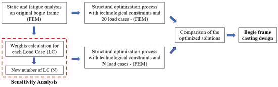 In this research activity, the frame of a railway bogie used for a metropolitan vehicle was studied to create an innovative design. A robust campaign of topological–structural optimization was conducted on the component with the aim of achieving an appropriate simulation setting. Two main aspects characterized the novelty of this research. The first involved the utilization and control of technological constraints oriented towards an innovative and potentially manufacturable design for sand-casting. This approach is yet to be explored in the railway field, especially for critical components such as railway bogie frames. The second innovation included the implementation of a comprehensive sensitivity analysis to understand the most critical load conditions used for the mechanical verification of this component. This allowed for a streamlined and focused structural optimization based on the sensitivity analysis results. Significant reductions in computational times were achieved. The obtained design proved to be consistent and practically identical to that obtained through the complete simulation, fully meeting the objectives of this research activity. In addition, improvements in terms of stress distributions and concentrations were observed.