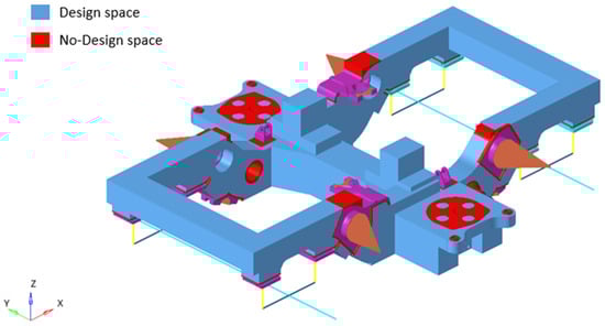 Figure 7, the design space is shown in light blue, while the non-design space is represented in red. The non-design space mainly included areas of interface with other systems, load application zones, and connection zones to supports. Giving special attention to the latter, this choice allowed for the main interfaces to remain unchanged, enabling the separate management of modifications to the main frame and those to the supports.