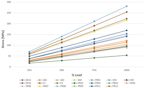 The second step involved quantifying the uncertainty for each chosen output. All load cases were analyzed, remembering that each was composed of a combination of a certain number of loads. Each contribution was tested at 25%, 50%, 75%, and 100% of the value required by the reference standard. This approach allowed for the consideration of realistic variations in the loading conditions to which the bogie frame could be statistically subjected, as well as verifying the linear behavior of the calculated outputs. It was demonstrated that by varying the percentage of each load contribution, stresses would vary linearly, thereby maintaining the criticality of the considered load cases unchanged. This analysis was conducted on all critical nodes, and the results are reported in
