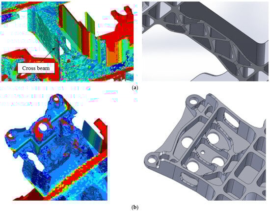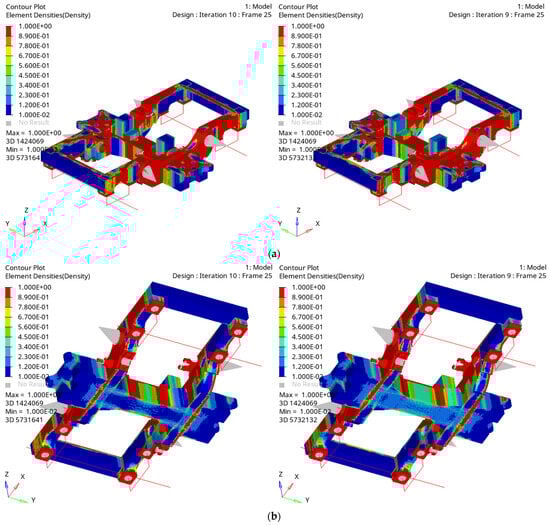 The optimization constraint was imposed on mass fraction. It is the ratio between the final and the initial mass of the design space. It was set below 40%, a value generally adopted for topological optimization. The “Pattern grouping” setting allowed for the introduction of a symmetry condition with respect to a midplane of the bogie frame with the normal orientation along the y-direction. This condition was needed due to the characteristics of the loads that were applied only on one side of the bogie, creating an asymmetrical distribution of the material. After several tests, the value of the “Minimum feature size” setting was defined equal to 25 mm. It allowed us to ensure the correct level of detail in the optimized geometry. Finally, the “Draw single” setting forced the removal of material along a predefined direction. This technological constraint aims to simulate the extraction of the model from a mold, creating a geometry opened in the upper side or lower side, depending on the direction set.