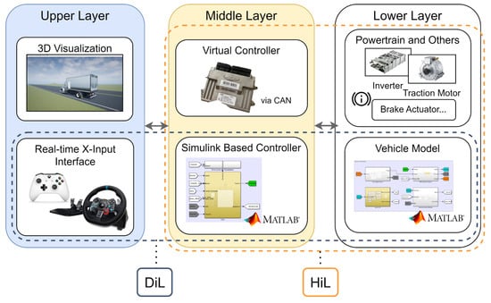 Figure 14, extend its capabilities. The driver-in-the-loop (DiL) concept allows for the simulation of vehicle controllers with virtual drivers in an interactive environment, streamlining the validation process and enabling the development of controllers via user feedback. This approach is safer, more cost-effective, and more controlled compared to real-world vehicle tests.